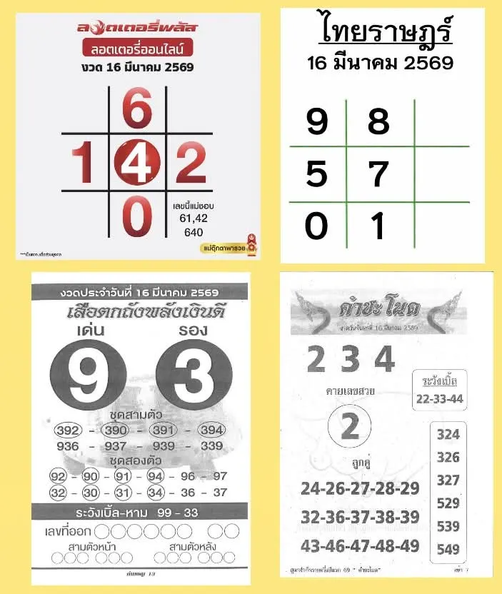 มาอีกชุด! รวมเลขเด็ดหลายสำนัก งวด 16 มีนาคม 2569 กระแสเลขเริ่มชัด คอหวยตามดูด่วน