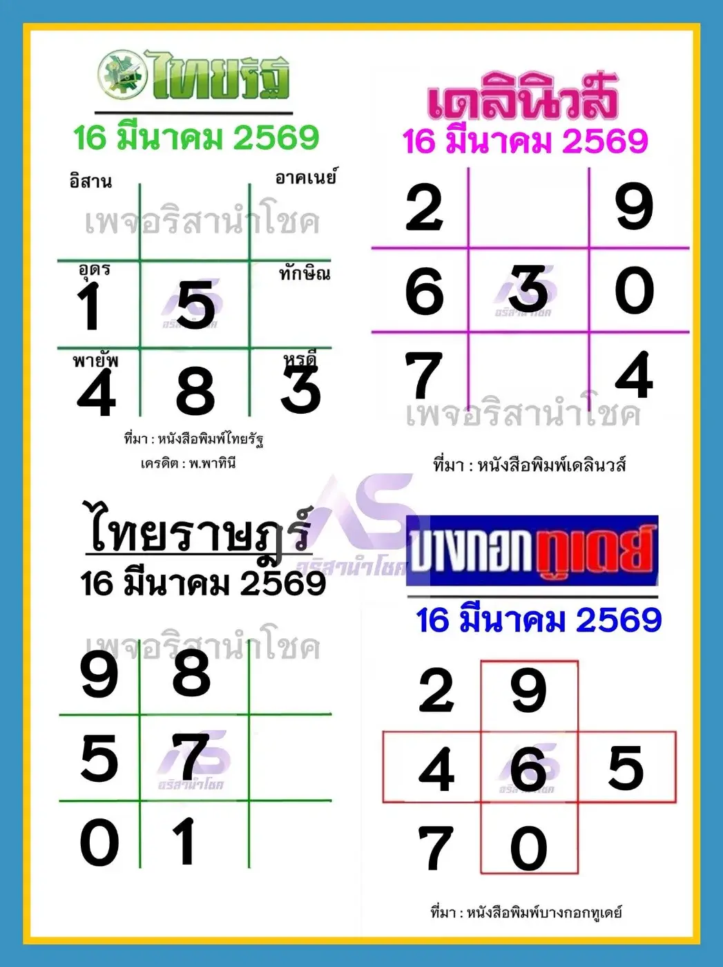 เลขดังของสำนักพิมพ์จะประกอบไปด้วยเลขเด็ดไทยรัฐเลขเด็ดเดลินิวส์เลขเด็ดบางกอกทูเดย์และเลขเด็ดไทยราษฎร์ งวดวันที่ 16 มีนาคม 2569 โดย มีเลขตารางตามภาพประกอบภายในโพสต์นี้ซึ่งคอหวยท่านใดชื่นชอบสามารถ หยิบจับเลขตารางของสำนักพิมพ์ไปพิจารณาลงทุน ในงวดนี้กันได้เลย