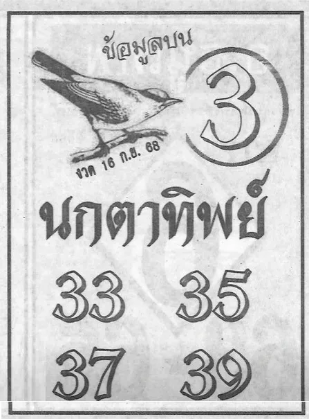 เลขเด็ด นกตาทิพย์ งวดวันที่ 16/9/68 นี้ก็ได้ปล่อยเลขเด็ดดีๆ ที่ได้คัดสรรมาเป็นพิเศษให้บรรดาคอหวยได้นำไปพิจารณาตัวเลขกัน สำหรับใช้เป็นแนวทางในการเสี่ยงโชค หรือซื้อลอตเตอรี่ สามารถเข้าไปส่องที่ใบหวยด้านล่างกระทู้นี้ได้เลย และสำหรับแนวทางข้างต้นนั้นก็เป็นแค่เพียงส่วนหนึ่งของการคาดการณ์ และพิจารณาตัวเลข โปรดใช้วิจารณญาณในการรับชมด้วย หากท่านใดที่มองดูผ่านๆ แล้วยังไม่ถูกใจ ก็สามารถที่จะข้ามไปได้เลย แต่ถ้าหากถูกชะตาแนะนำว่าให้รีบไปซื้อล็อตเตอรี่ เพราะเศรษฐีในงวดนี้อาจจะเป็นคุณก็ได้ ใครจะไปรู้ ขอให้โชคดี ร่ำรวยถูกหวยทุกคน เพี้ยง!